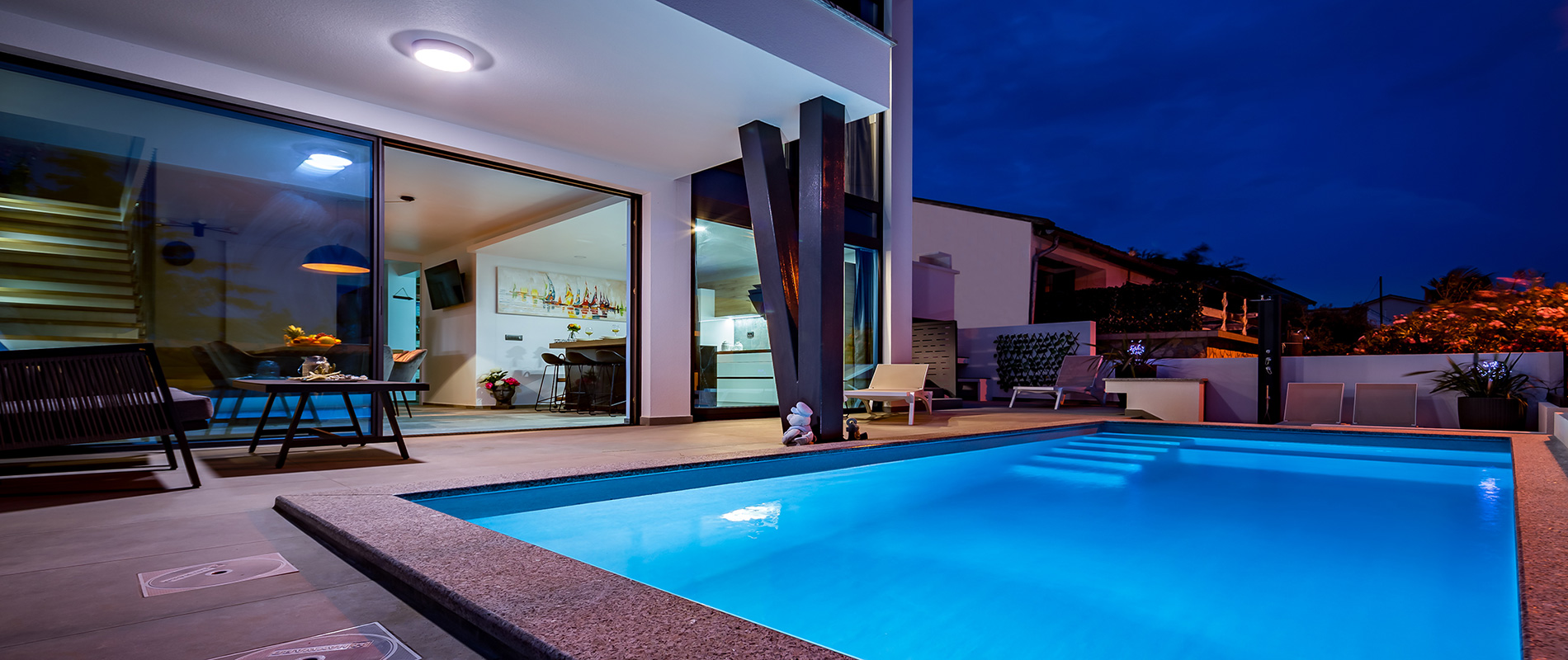 Opustite se na natkrivenoj terasi na ležaljkama za sunčanje ili u lounge zoni uz jutarnje i popodnevno ispijanje kave, uživajte u ljetnoj kuhinji sa grilom sa velikim stolom za blagovanje u objedovanju na otvorenom i plivajte u našem vanjskom grijanom bazenu.